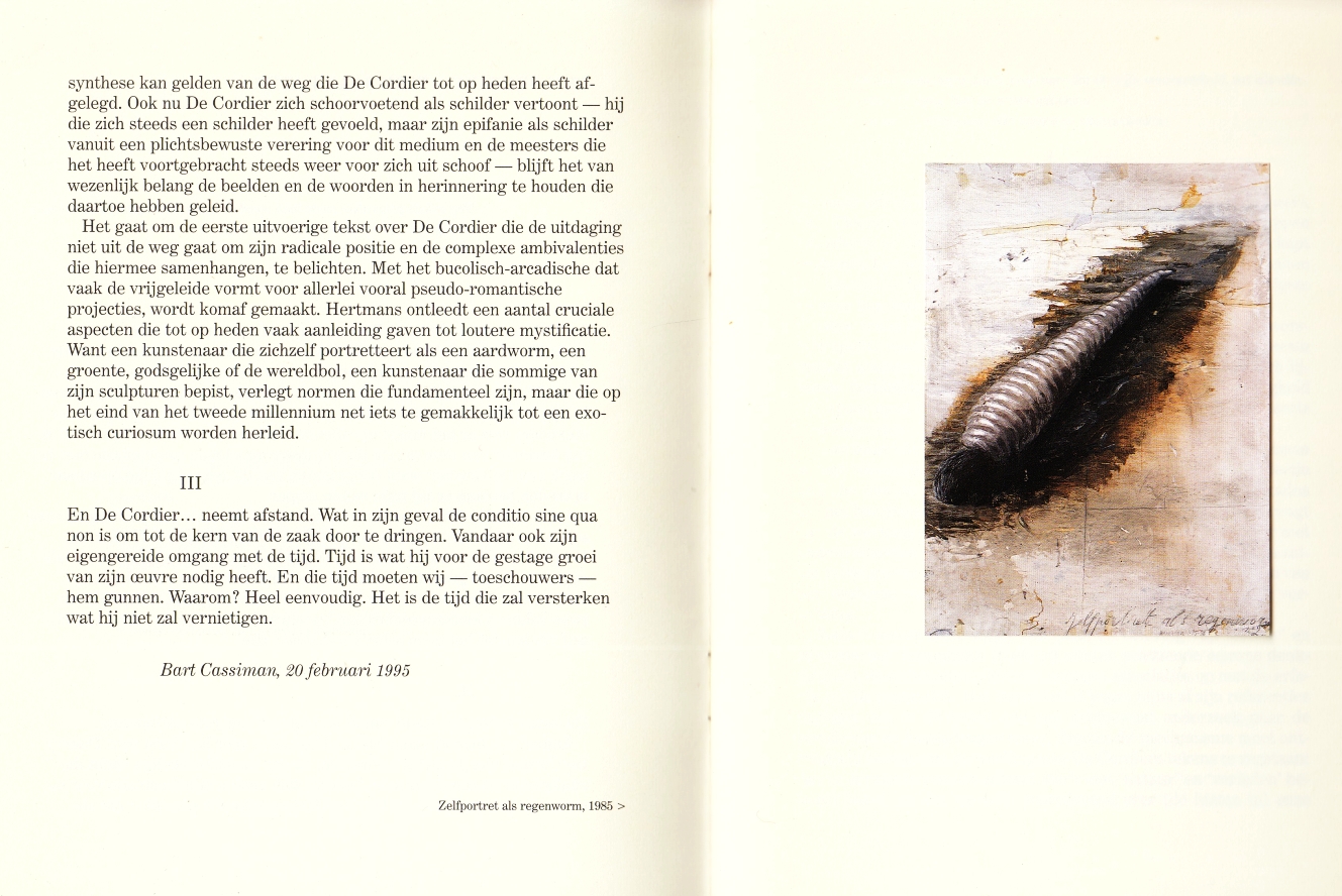 38. HERTMANS, Stefan Eenzaam op de marktplaats. Over het werk van Thierry De Cordier. (Met een ingeplakte illustratie (‘zelfportret als regenworm’)). (Brussel), Hayen, (1995). Geniet. (24) p. Oplage 750 exemplaren.1e druk.