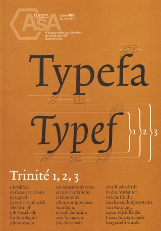 Bijgevoegd: Trinité: een nieuw lettertype. Eén blad gevergeerd papier. (Overdruk uit JEZ-pers afl. 6, 1982, het personeelsblad van Joh. Enschedé en Zonen).