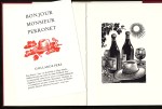 39. (WIJN). RUETER, Pam G., & Anne H. MULDER Bonjour monsieur Perronet. (Met acht originele houtgravures door Pam G. Rueter). (Zutphen), Gaillarde Pers, (1970). Ingenaaid met omslag. 24 p. Gedrukt in rood en zwart in een oplage van 75 genummerde en door auteur en kunstenaar gesigneerde exemplaren.