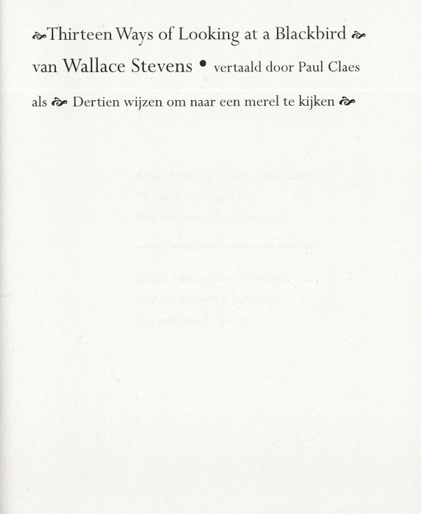 32. STEVENS, Wallace Thirteen Ways of Looking at a Blackbird. Vertaald door Paul Claes als Dertien wijzen om naar een merel te kijken. Gent, Druksel, 2012. 18 x 15 cm. Cahiersteek. 32 p. Gezet uit de Perpetua en gedrukt in 126 gesigneerde exemplaren. 1e druk.
