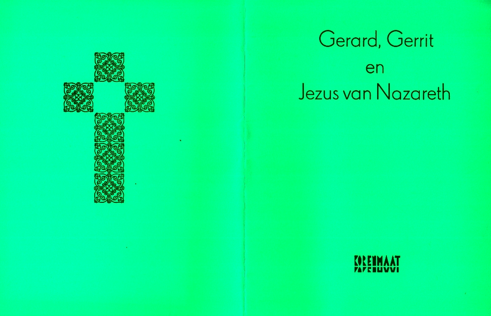 17. (KOUWENAAR, Gerrit) Gerard, Gerrit en Jezus van Nazareth. [Haarlem], Korenmaat, (2021). Cahiersteek met felgroen omslag. ‘op Tom & Otto Silk gedrukt voor de Zeven Zwarte Handen en een aantal andere belangstellenden’. 1e druk.