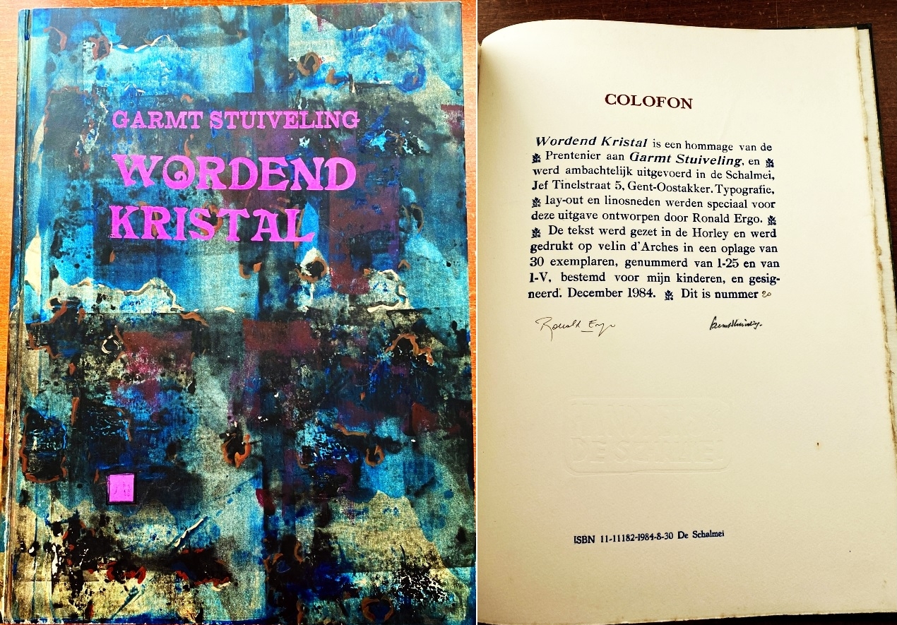 35. STUIVELING, Garmt Wordend kristal. Kwatrijnen. (Met vier originele, gesigneerde linosneden van Ronald Ergo).). (Gent-Oostakker), De Prentenier, (1984). 45,5 x 34 cm. Met de hand versierde kartonnen band. Met de hand gezet uit de Horely en gedrukt door Ronald Ergo in een oplage van slechts 30 genummerde en door Ergo en Stuiveling gesigneerde exemplaren.