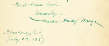 31. MEIGS, Charles Hardy Opdracht aan Ralph Neave, gesigneerd en gedateerd Flushing, July 19, 1937. Getint papier, mogelijk uit een boek. 16 x 12 cm. In groene inkt. 8 regels, deels een citaat van Zophar (dat is een vriend van Job uit het Oude Testament). ‘Souvenir of a happy meeting at Orient Point’.