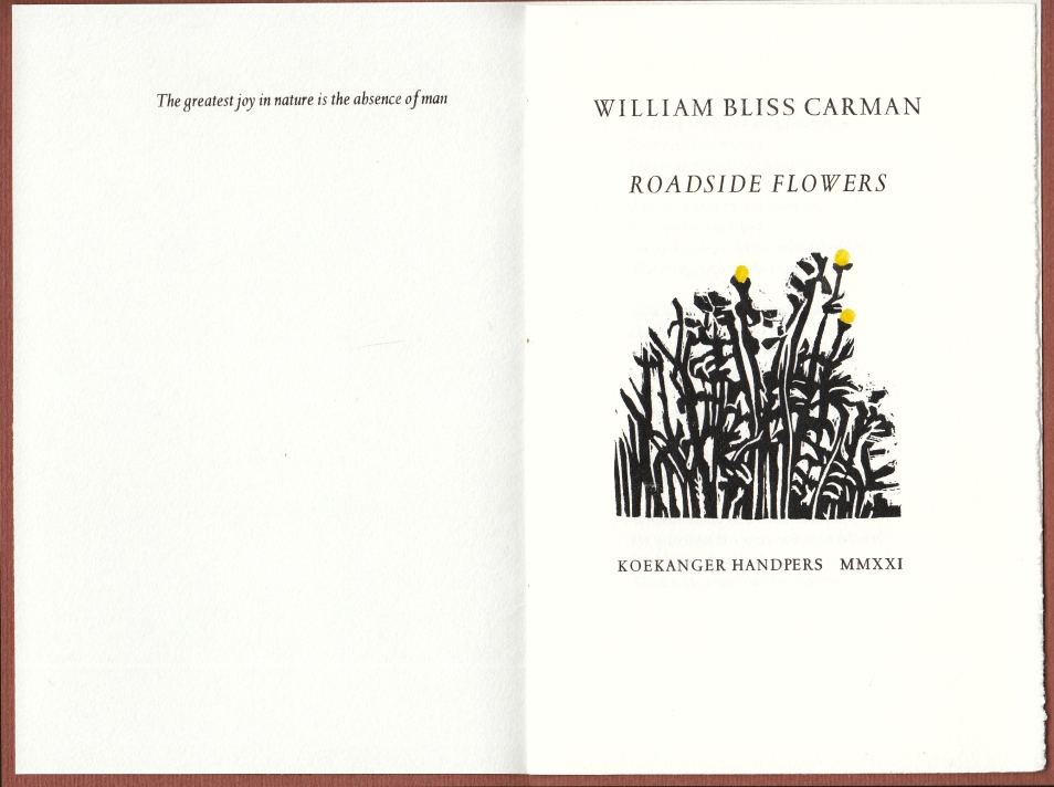 27. (KOEKANGER HANDPERS). CARMAN, William Bliss Roadside flowers. [Koekange], Koekanger Handpers, 2021. Cahiersteek. (8) p. Met de hand gezet uit de Spectrum en gedrukt in een oplage van 75 exemplaren. Versierd met een linosnede in twee kleuren.
