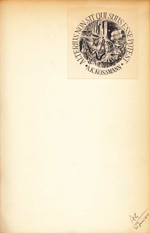 * Op de eerste pagina zien we de paraaf ‘A.K./ 20 Juni 1938’ en een mooi exlibris van Alfred Kossmann met de spreuk ‘Alterius non sit qui suus esse potest’ ofwel Wie zijn eigen meester kan zijn, moet niet van een ander afhankelijk zijn (Paracelsus).