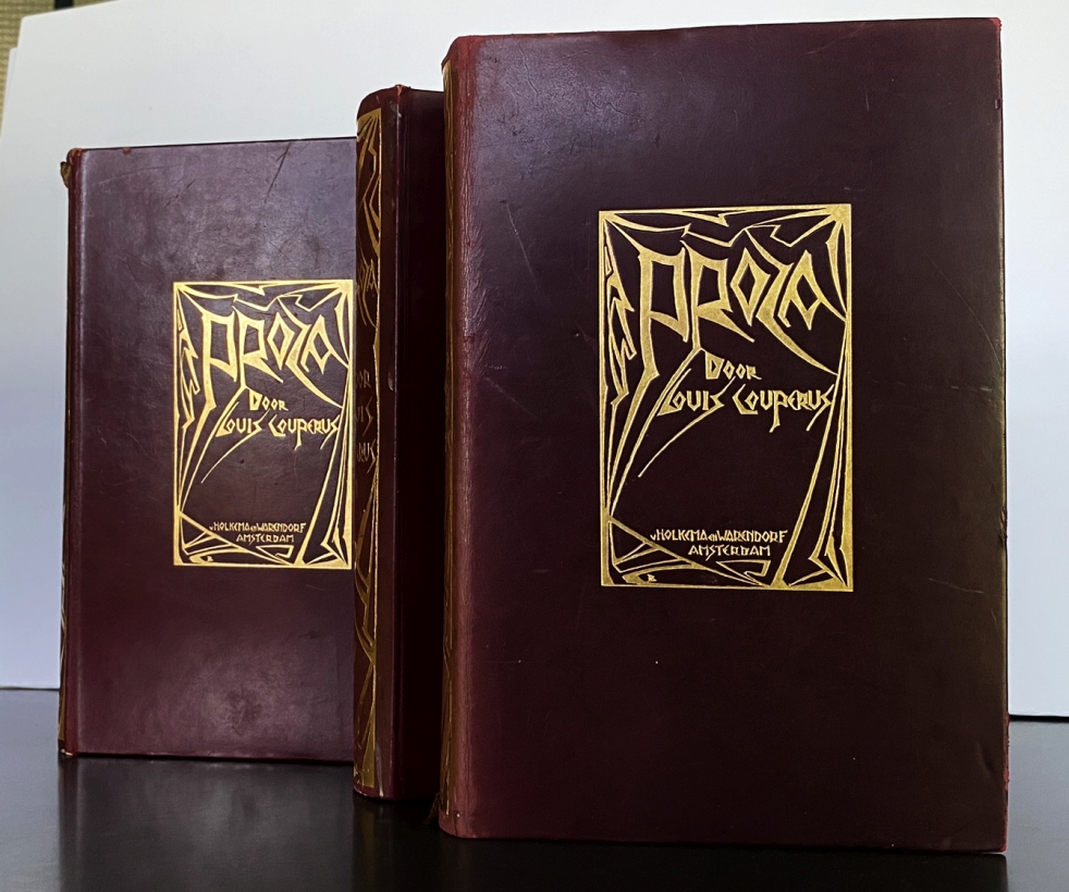 * De verhuld-autobiografische roman, een eerste druk uit 1897 in de latere Berlage-band van Couperus’ verzameld werk, met versiering op voor- en achterkant. Van Vliet 178,5. Collectie Veen 1.4.2 (= mét het bindersmerkje op achterkant en andere subtiele verschillen). Matla 11 wb. Van beide varianten samen zouden er ca. 225 exemplaren in de Berlage-band zijn gebonden.