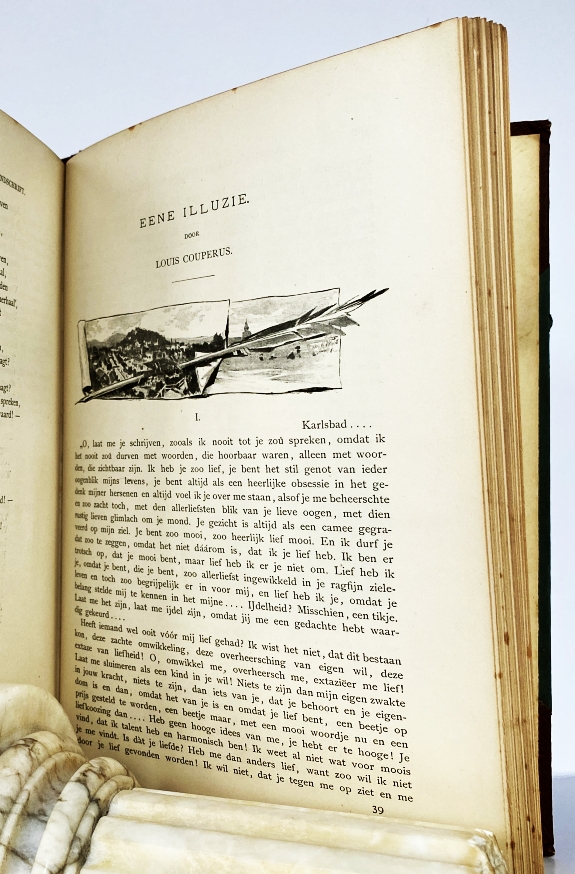 9. COUPERUS, Louis ‘Eene illuzie’. Pag. 585-613 in deel I van Elsevier’s Geïllustreerd Maandschrift, (1891). Amsterdam, Uitgevers-Maatschappij Elsevier, 1891. Originele halflinnen band met hoeken. (4), 644 p. Rijk geïllustreerd. 1e druk. Wat slijtageplekjes op de band; wat roest, vooral rond p. 220.