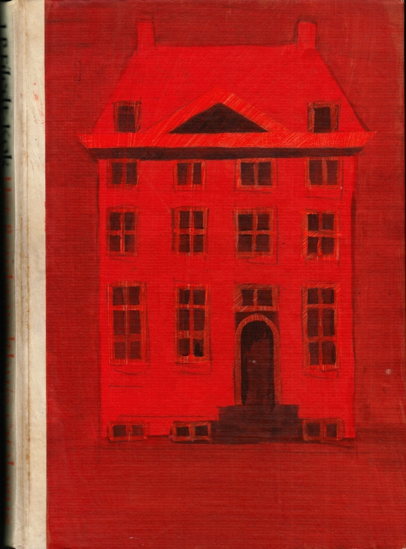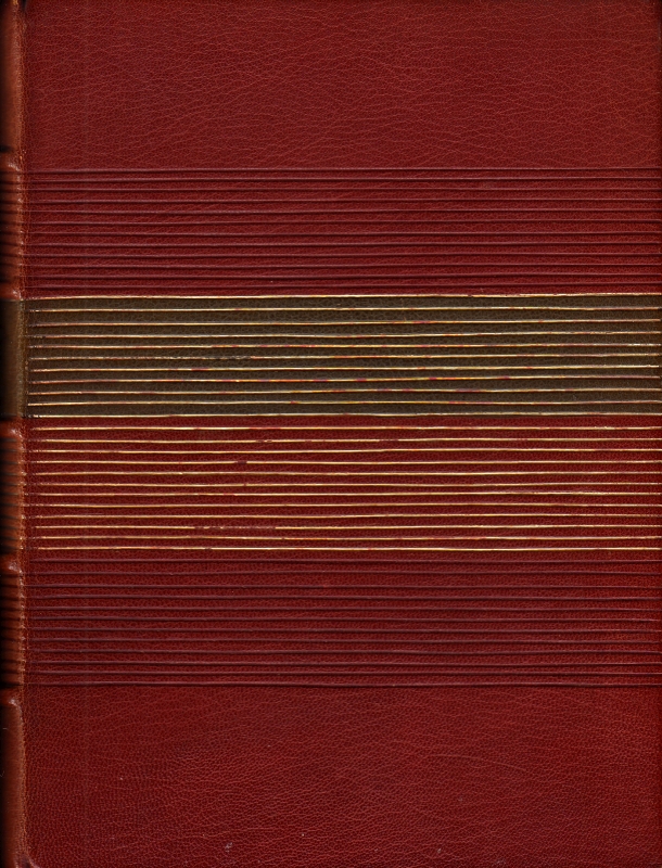 * Voor eigen gebruik vervaardigde Gerrit Noordzij soms boekbanden. Dit is een halfperkamenten band met op de rug een gekalligrafeerde titel in rood en zwart en op het voorplat een eigenhandige gouache van het Rembrandthuis. Op de achterkant zien we het watermerk ‘Greuze’ van het papier decoratief afsteken.
