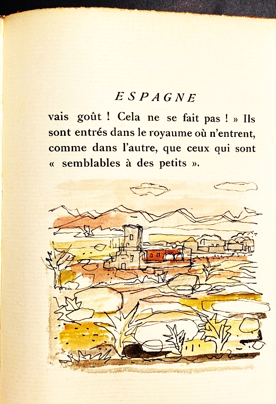 * Algerije, Tunesië, Spanje, de Franse zuidkust. Reisschetsen van Montherlant getruffeerd met twintig originele tekeningen in pen en aquarel door Sariochmin Salim (Medan 1908-Parijs 2008), voorzien van een luxe boekband van Henny Berkemeier (kalligrafisch etiket achterin), van roodbruin marokijn ingelegd met groen en voorzien van horizontale lijnen in goud- en blindstempel. Een leuke ribbelband met reliëf, goud en kleur.