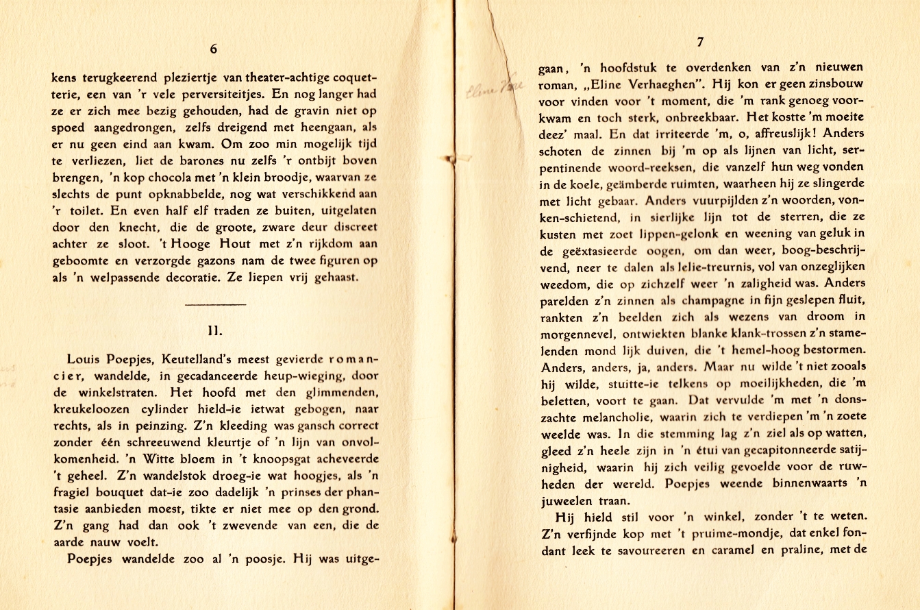 8. BROEDELET. Joh. W. Hofstad. Zeist, Meindert Boogaerdt, 1910. Twee delen. Ingenaaid. (4), 272; (4), 256 p. 2e druk. Langs rug en randen met scotch tape verstevigd. Voorin enkele eigenaarsnamen, o.a. Mispelblom Beyer en Van Voorthuyzen. Met in de marge in potlood notities over figuren in de roman en hun mogelijke voorbeeld in het werkelijke leven. Pagina 1 verbruind door papier dat er in heeft gelegen.