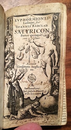 3. BARCLAY, John Euphormionis Lusinini sive Ioannis Barclaii Satyricon Partes quinque cum clavi. Accessit Conspiratio Anglicana. Amsterdam, G. Blaeuw, 1634. 11 x 7 cm. Perkament met versleten titeletiket en verguld nummer en initialen op de rug. (8), 582 p. Geheel in het Latijn. Fijn gegraveerde titelpagina voor deze aantrekkelijke herdruk. Band gevlekt. In het midden twee iets uitstekende katernen. Titel wat gevlekt en met een vage naam. Enkele kanttekeningen en onderstrepingen. Een paar kleine papierreparaties. Twee catalogusvermeldingen uit de 20e eeuw geplakt op binnenkant achterplat.
