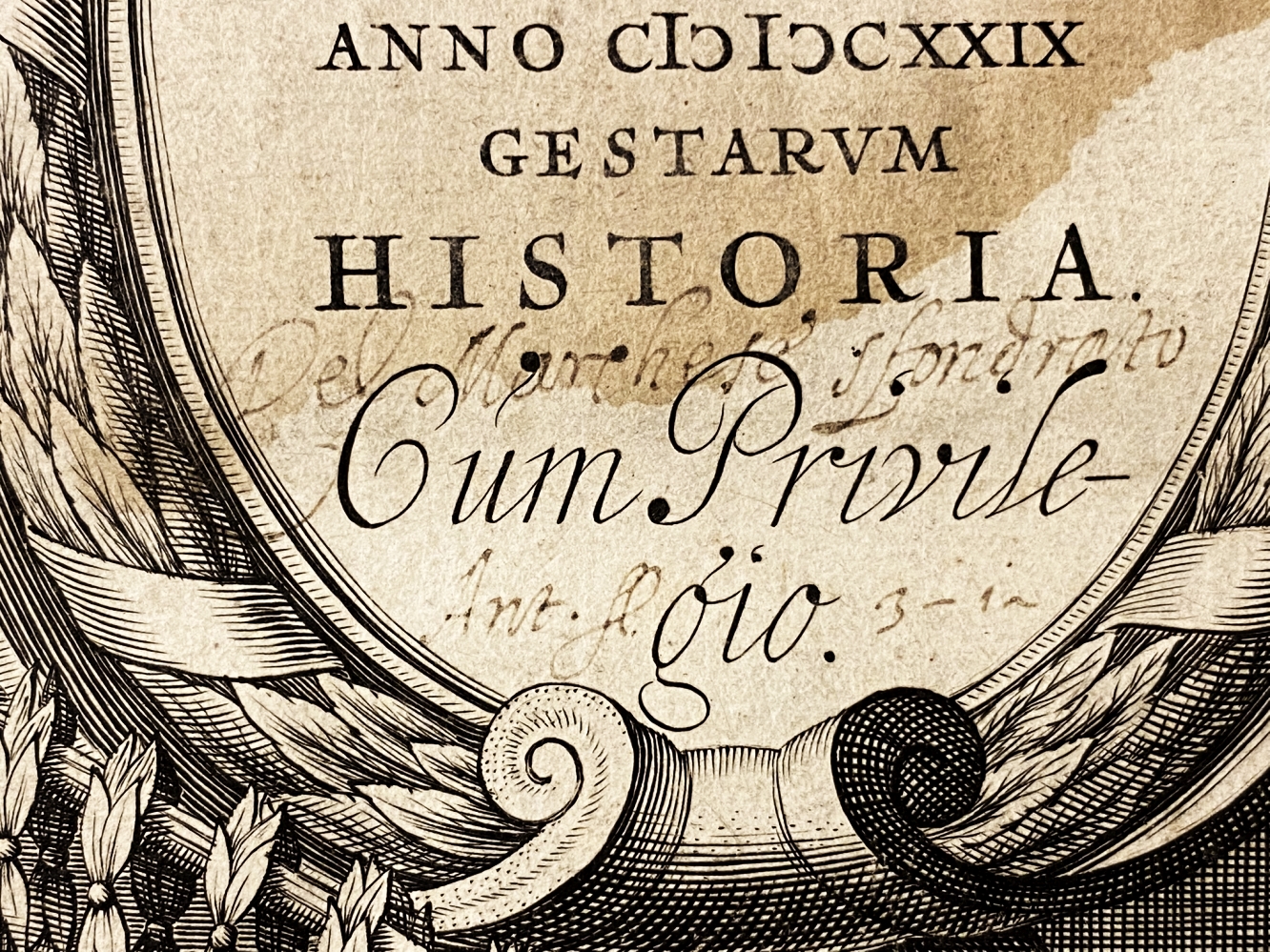 Interessante provenance: op de titelpagina is met sierlijke krullen in de titelcartouche geschreven ‘Del Marchese Sfondrato/ Ant.fl. 3-14’. Dit kan alleen Sigismondo Sfondrati, markies van Montafia betreffen, een Italiaanse generaal in het Spaanse leger, die in 1637 aan het Beleg van Venlo deelnam en na een lange carrière in de Tachtigjarige Oorlog in 1652 zou sneuvelen bij Grevelingen (Gravelines). Allicht was een werk over de verovering van Den Bosch voor Sfondrati een belangrijk studieboek. Van hem is dit boek dus gekocht voor drie gulden en veertien stuivers.