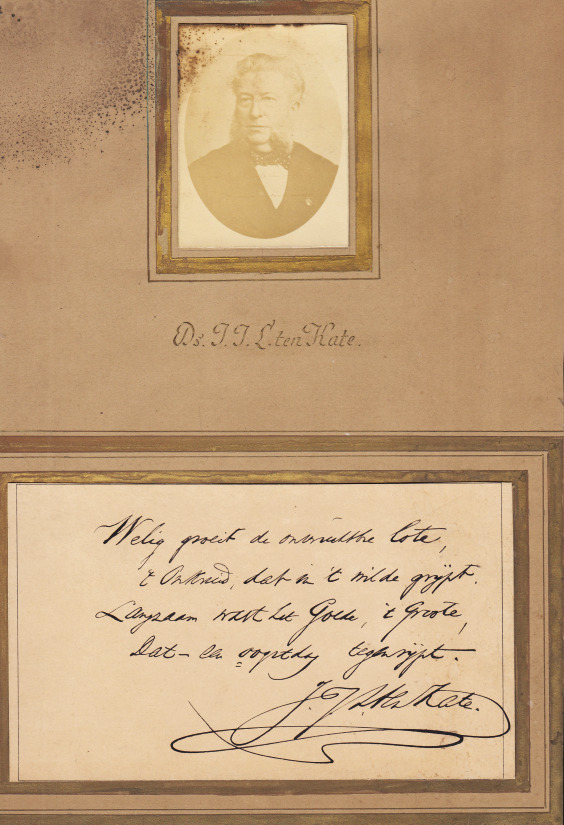 31. KATE, J.J.L. ten ‘Welig groeit de onvruchtbre lote,’. (Gedicht). Handschrift in inkt. Gedicht van 4 regels. Gesigneerd. 7,2 x 10,1 cm. Geplakt op (gevlekt) karton (28 x 20 cm) waarop ook een originele, contemporaine portretfoto van Ten Kate is geplakt (7,6 x 5,8 cm). De foto heeft in een hoek ook wat vlekjes meegekregen.
