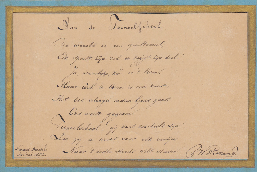 * Kennelijk afkomstig uit een album met handschriften van dichters voor de in 1874 gestichte Amsterdamse Tooneelschool. Een braaf gedicht: ‘Tooneelschool! gij kunt voorbeeld zijn/ Zoo gij u wacht voor elk venijn’. P.H. Witkamp (1816-1892) schreef veel over de geschiedenis van Nederland en met name Amsterdam, maar werd vooral bekend als geograaf en topograaf: hij tekende o.a. (school)atlassen en -kaarten.