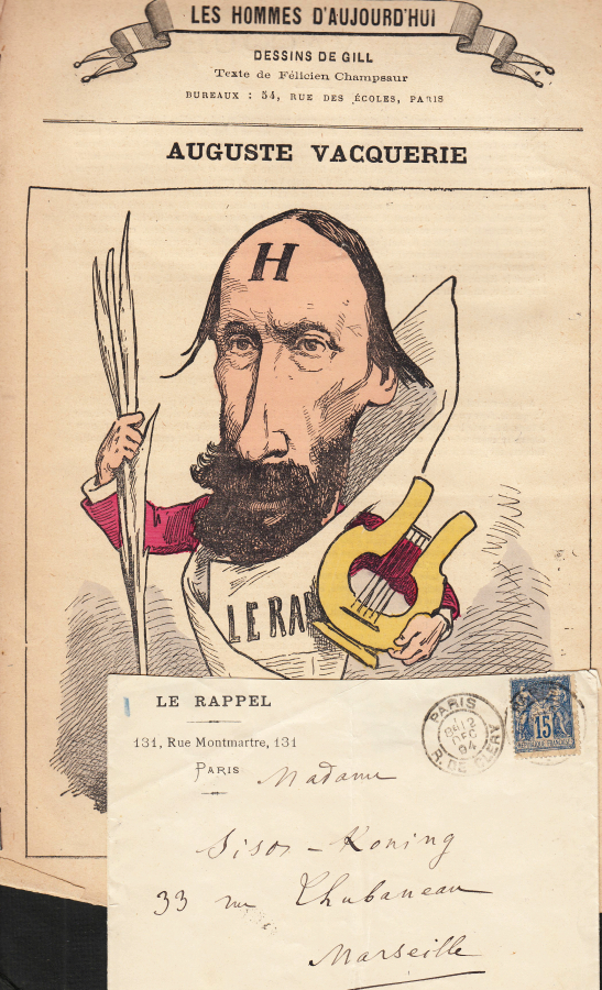 * Eén brief voor Monsieur Vollar (?), gedateerd ’10 Mars 1888′, met gefrankeerde envelop. Eén voor Cher Monsieur’ (ongedateerd). En één voor ‘Ma chère N…’ (naam doorgestreept) en gesigneerd ‘Je vous embrasse affectueusement, Françisque Sarcey’, niet gedateerd, maar omstreeks 1880. Sarcey (1827-1899) was een beroemde Franse journalist en theatercriticus. Gill tekent hem balancerend op een verrekijker.