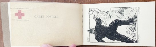 41. RAEMAEKERS, Louis Dessins d’un neutre. Vendu au profit de la Croix-Rouge Française. (21 ansichten in boekje). Amsterdam, De Telegraaf, ca. 1915. Oblong 8,5 x 16 cm. 21 kaarten, elk met beschermvloei, als afscheurboekje met omslag. Compleet. Zeer gaaf en netjes.