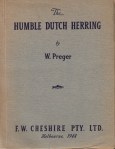 40. PREGER, W. The Humble Dutch Herring. Melbourne, F.W. Cheshire Pty., Ltd, 1944. 24 x 19 cm. Ingenaaid. 64 p. Met kaarten, tekeningen en foto’s. 1e druk. Overstekende randen onvermijdelijk wat gekreukt. Wat verbleekt. Voorin is een stukje over de auteur geplakt, misschien overgenomen van een stofomslag? En voorin de handgeschreven naam van H. Goudkade/ Camp Columbia 1945.