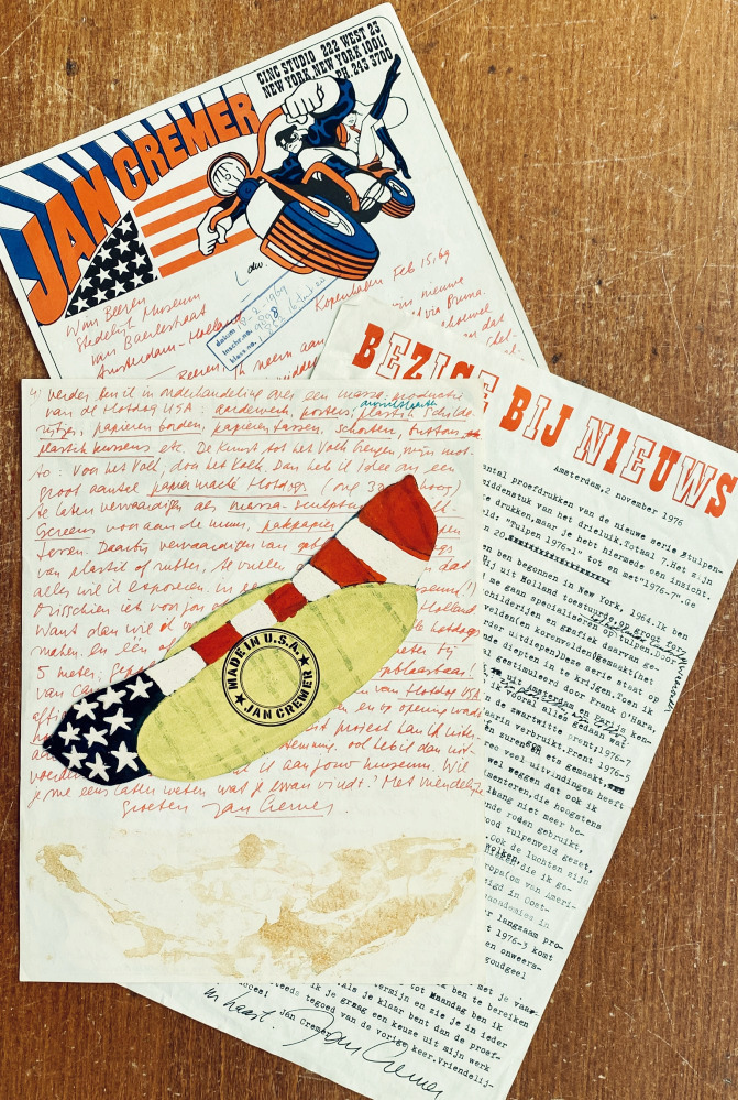 * Vooral de eerste brief is fantastisch: vier volgeschreven zijden (88) regels) op twee bladen eigen, geïllustreerd briefpapier (‘Cinc Studio, 222 West 23 New York’, met een ilustratie van Jan Cremer op een motor met een schaars geklede vrouw achterop). Uitgebreid over het schrijven van toneel ‘ik ben nu bezig aan nog een eenakter (een dolkomiese klucht) en ga dan Het Grote Stuk schrijven (over de vermiste l. kloot van A. Hitler)’. Verder vooral over zijn schilderwerk: ‘Ik schilder nu al jaren (sinds 1965) in Amerika Tulpenlandschappen en Hotdogs. Meer niet. Maar ik heb me er erg in gespecialiseerd! Willem de K. is één van mijn grote bewonderaars van tulpenlandschappen en Bob Dylan heeft het eerste doek van mij in zijn huis’. Op het schilderen van hotdogs gaat hij nog een tijdje door: ‘Verder ben ik onderhandeling over een massa-productie van de Hotdog USA: aardewerk, posters, ansichtkaarten, plastik schilderijtjes, papieren borden, papieren tassen, schorten, buttons, plastik kussens etc. De Kunst tot het Volk brengen is mijn motto: voor het Volk, door het Volk’. Verder heeft hij plannen voor een grote hotdog-manifestatie met opblaasbare hotdogs tot 15 meter lengte. ‘Dit project kan ik uiteraard pas beginnen als ik bestemming weet, ook heb ik dan uitvoerders nodig. Daarom denk ik aan jouw museum’ (Beeren was van 1965 tot 1971 hoofdconservator van het Stedelijk Museum in Amsterdam). Onder de brief zit (of eigenlijk zat, hij is losgeraakt) een uitgeknipte afbeelding van de door Cremer bedachte ‘US Hotdog’.