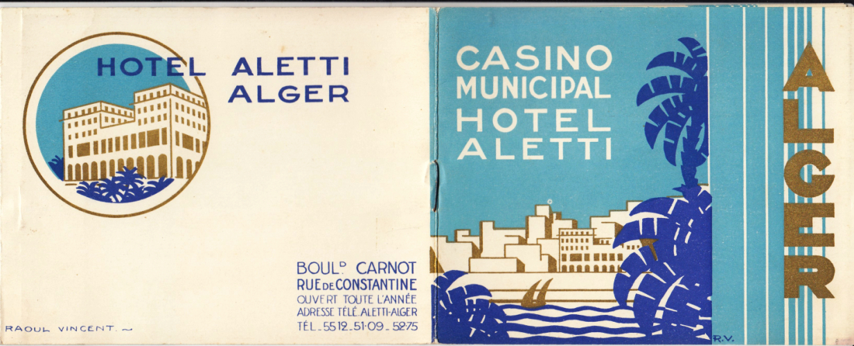 54. VINCENT, Raoul Casino Municipal Hotel Aletti. Algiers, J. Aletti, 1935. Geniet. 12 p. Gedrukt in goud, bruinrood en twee kleuren blauw. Net exemplaar.