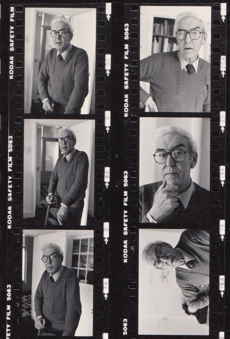 8. (BRAKMAN, Willem). Chris van HOUTS Vel met 34 contactafdrukken van foto’s van Willem Brakman. 30,2 x 20,3 cm. Met op de achterzijde copyrightsticker van de fotograaf met contactgegevens. Paar vlekjes.