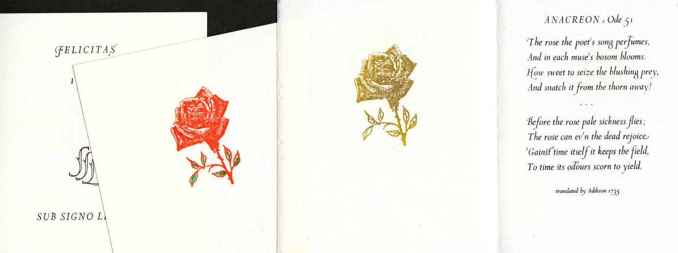 2. ANACREON Ode 51. (Met een illustratie). Sub Signo Libelli, [1994]. Klein formaat. Vouwblad. Met de hand gezet en gedrukt in goud en zwart.