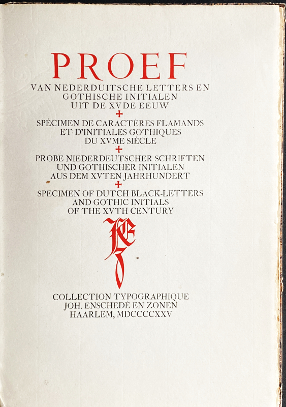 * Deze letterproef bevat de trots van de typografische archieven van Enschedé: de Oudnederlandse en gotische letters, die onder auspiciën van Jan van Krimpen in de moderne bibliofiele druk werden gebruikt. Alle tekst is gezet uit historisch materiaal. Met bibliografische gegevens. Van Krimpen deed zijn uiterste best om dit boek te verfraaien met door hem getekende initialen, die in rood gedrukt werden. Lane-Lommen nr. 95.