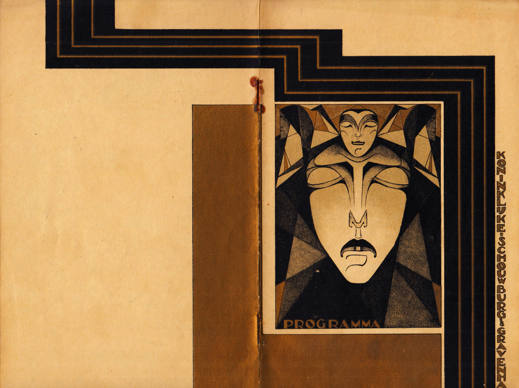 * Fantastisch expressionistisch serieontwerp van Pieter A.H. Hofman, dat gedurende enkele jaren met kleine variaties door het Vereenigd Tooneel gebruikt werd. Advertenties voor de Hupfeld-phonola en Edison-radio’s.