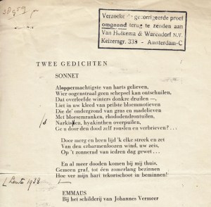 7. BOUTENS, P.C. Twee gedichten. ‘Sonnet’ (en) ‘Emmaüs. Bij het schilderij van Johannes Vermeer’. (Drukproef). Twee bladen, eenzijdig bedrukt, met paginacijfers 1 en 2. Met stempel van uitgeverij Van Holkema & Warendorf. Gevouwen en iets gekreukt, met speldengaatjes en randplakbandjes.