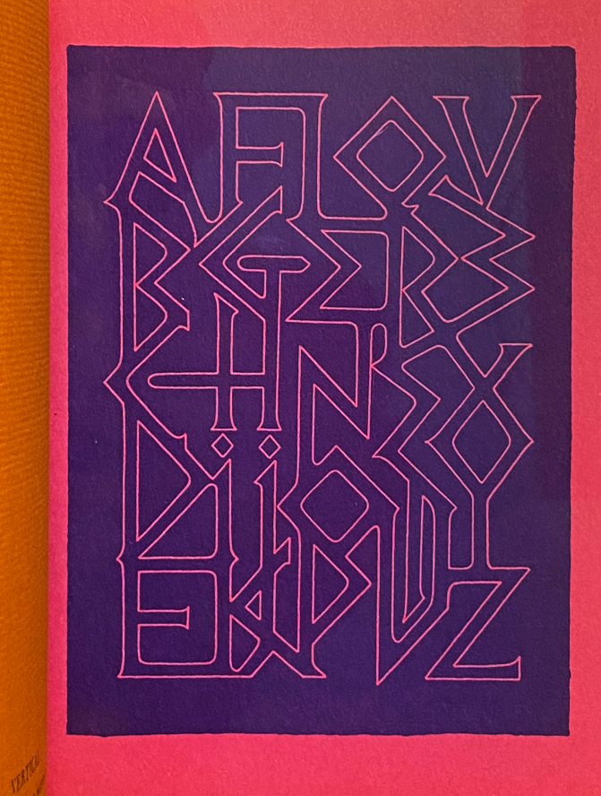 17. KINDERSLEY, David Variations on the Theme of Twenty-Six Letters. Wellingborough, Skelton’s Press, 1969. 21 x 16 cm. Chinese blokboekbindwijze (‘French fold’). 42 p. verschillende kleuren G.F. Smith’s Strathmore Artlaid en Plan 8-papier, bedrukt in kleuren. Gedrukt in 500 exemplaren. Omslag met uitgeverscellofaan. Het papier daaronder is iets opgekruld.