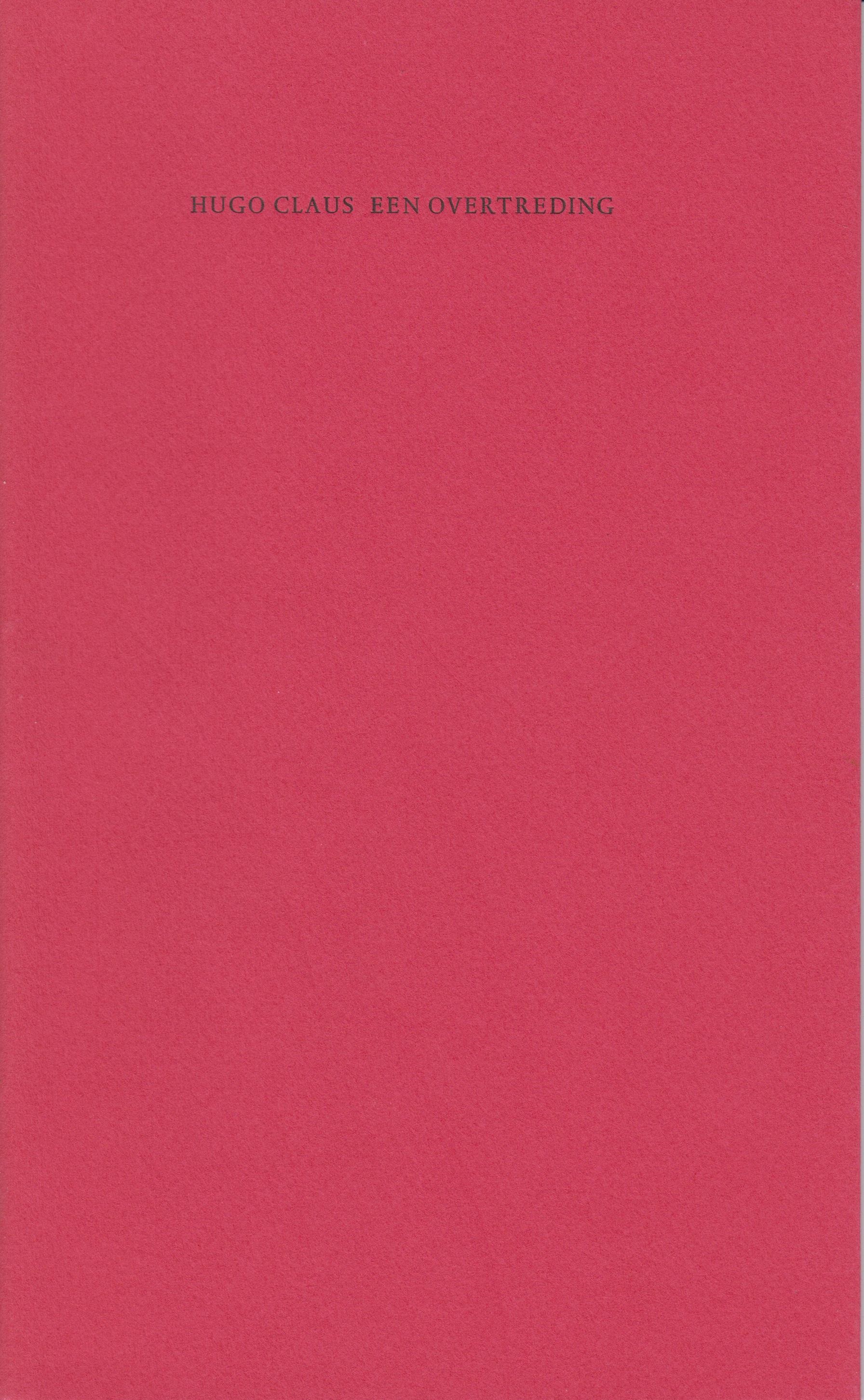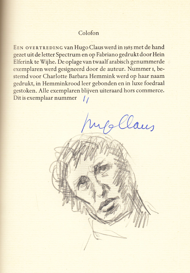 5. CLAUS, Hugo Een overtreding. (Met een Aantekening door Gert Jan Hemmink). Amstelveen, AMO, 1985. Ingenaaid in omslag. (16) p. Met de hand gezet uit de Spectrum en gedrukt door Hein Elferink op Fabriano in een oplage van 12 door de auteur genummerde en gesigneerde exemplaren. 1e druk. Met onder het colofon een potloodtekening van een gezicht door een onbekende. Wie het voorstelt weten we ook niet, maar in ieder geval niet Claus.