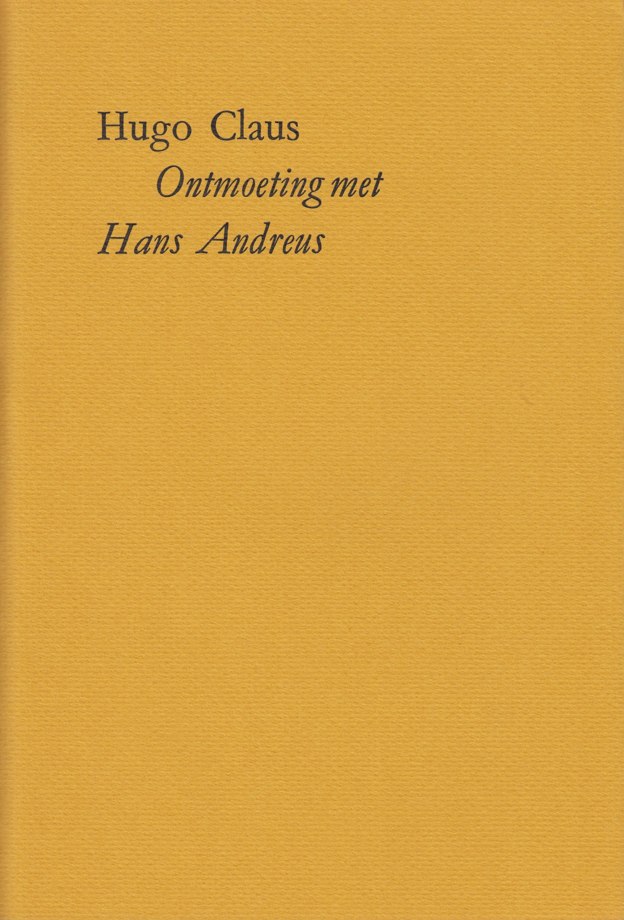 4. CLAUS, Hugo Ontmoeting met Hans Andreus. (Met een originele ets door Hugo Claus, op de plaat geëtst door Joost Veerkamp. Met een Nadien door Hugo Claus. Met een Aantekening door Gert Jan Hemmink). Amstelveen, (AMO), 1991. Ingenaaid met omslag. (18) p. Met de hand gezet uit de Bembo en gedrukt door Hein Elferink in een oplage van 35 door de auteur genummerde en gesigneerde exemplaren. 1e druk.