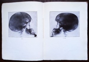 20. GOLL, Claire & Ivan Poèmes de la vie et de la mort. Avec deux radiographies. Paris, Jean Budry & Cie, 1927. 26 x 19 cm. Ingenaaid met origineel gewolkt omslag en titeletiket, omhuld met kristalpapier, dat op de binnenranden is vastgeplakt. 48 p. Met twee röntgenfoto’s, een van de schedel van Ivan en een van Claire Goll als frontispice (!). Gedrukt in 360 genummerde exemplaren. 1e druk. Wat verbruind, plaksporen op binnenkant omslag, aan de randen iets gesleten. Binnenin wat roest.