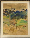 * Mooi landschapje van een kerk en enkele gebouwtjes in een dorp in Zwitserland. Een vorige eigenaar schreef in viltstift achterop de lijst: ‘Jef Last/ Zwitserland’.