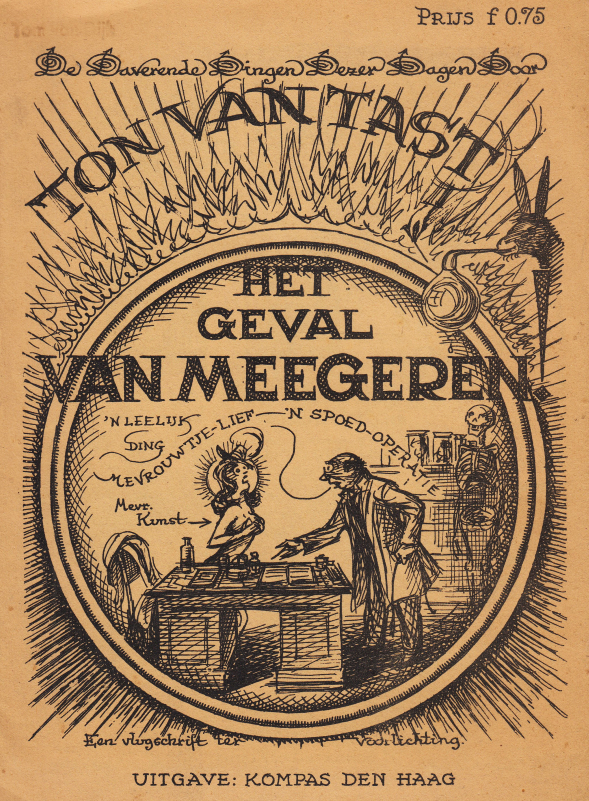 42. TAST, Ton van (= A. van der Valk) Het geval Van Meegeren. De Daverende Dingen Dezer Dagen. Een vlugschrift ter voorlichting Den Haag, Kompas, 1945. 24 x 18 cm. Geniet. 16 p. incl. omslag. 1e druk. Nietjes verwijderd. Vaag stempeltje linksboven voorop.