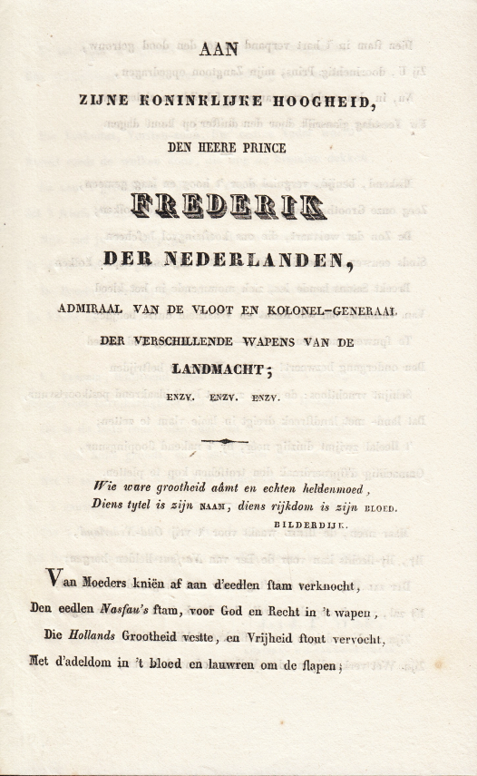 44. WAP, Jan-J.F. Aan zijne Koninklijke Hoogheid, den Heere Prince Frederik der Nederlanden, Admiraal van de vloot en Kolonel-Generaal der verschillende Wapens van de Landmacht; enzv. enzv. enzv. Zonder plaats of uitgever, 1831. Gevouwen blad, de eerste drie p. bedrukt. Lang gedicht (40 r.), gedateerd ‘Breda, den 27. van Sprokkelmaand, 1831.’ Zeer fris.
