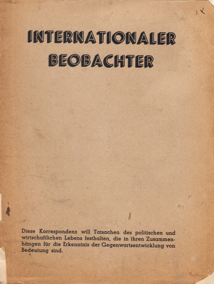 22. HINSE, J.M. Internationaler Beobachter. (Jg. 1 nr. 4, maart 1939). Amsterdam, J.M. Hinse (uitgever en redacteur), 1939. Geniet. (36) p. Gestencild. 1e druk. Omslag ligt los en in tweeën.