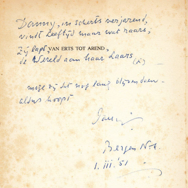 * Met opdracht: ‘Danny, in scherts verjarend,/ vindt leeftijd maar wat raars;/ Zij lapt [gedrukt:] Van erts tot arend,/ de Wereld aan haar laars/(je)/ moge zij dat nog lang blijven doen -/ aldus hoopt/ Jany./ Bergen N.H./ 1.iii.’51’