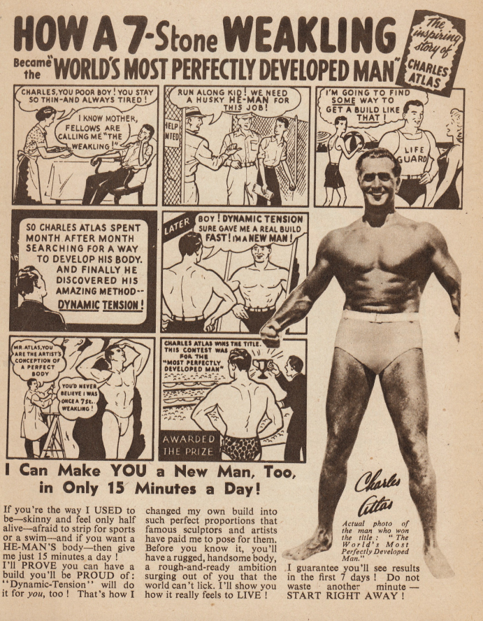 * Klassieke bodybuildersreclame van Angelo Siciliano (1892-1972), die in 1922 zijn naam liet veranderen in Charles Atlas. Mét de obligate strip achterop: ‘How a 7-Stone Weakling Become the World’s Most Perfectly Developed Man!’ (Only 15 Minutes a Day!).