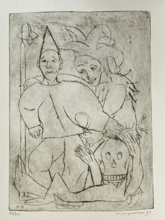 23. NIJHOFF, M. Pierrot aan de lantaarn. Een clowneske rapsodie. Met een naschrift door Marcel van der Heijden. (Met een originele, genummerde en gesigneerde ets door Geertrui Charpentier). Vught, Zolderpers, 1994. Ingenaaid met omslag. (2), 32 p. Gezet uit de Spectrum en gedrukt op Magani Incisioni in een oplage van 100 genummerde exemplaren.