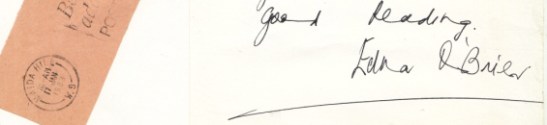 26. O’BRIEN, Edna Gesigneerd briefje. Maida Hill, 1983. Brief (17 x 13 cm) aan een Nederlandse handtekeningverzamelaar, gesigneerd en gedateerd ‘Jan. ’83’: ‘with/ good wishes/ and good reading’ (misschien staat er ‘great’). Met uitgeknipte en opgeplakte postzegel annex poststempel ‘Maida Hill’ (in Londen). De twee papieren samen op een groter stuk stevig papier geplakt.