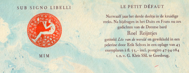 30. REIJNTJES, Roel Lös van de wereld. Sub Signo Libelli, 1999. Ingenaaid met omslag (door Erik Schots). (2), 14 p. Met de hand gezet uit de Fournier en gedrukt in groen en zwart in een oplage van 43 genummerde exemplaren.