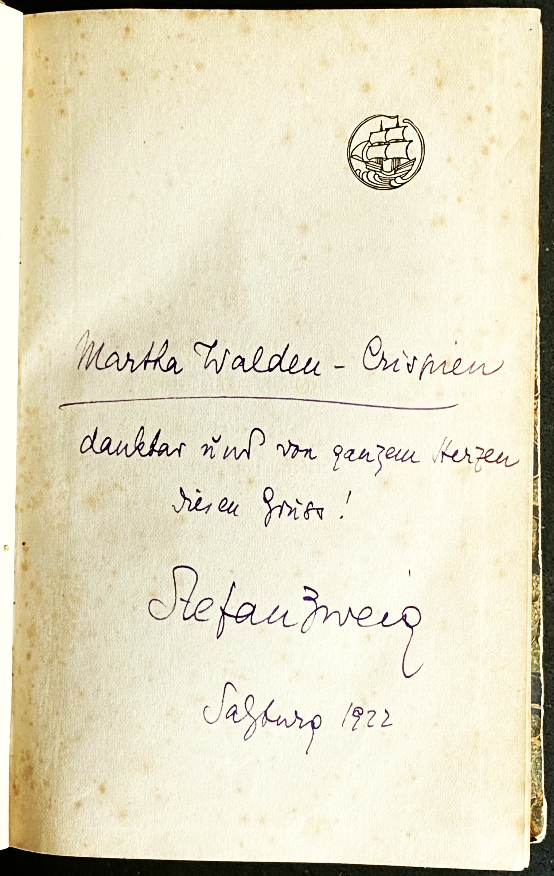 * Met handgeschreven opdracht van de auteur: ‘Martha Walden-Crispien/ dankbar und von ganzem Herzen/ diesen Gruss!/ Stefan Zweig/ Salzburg 1922’. Martha Walden (1891-1988) was getrouwd met de acteur Louis Chrispijn jr. Zij was bevriend met Stefan Zweig en Walther Rathenau. Bijgevoegd: haar autobiografie (1986), waarin Stefan en Friderike Zweig meermalen voorkomen.