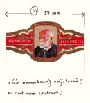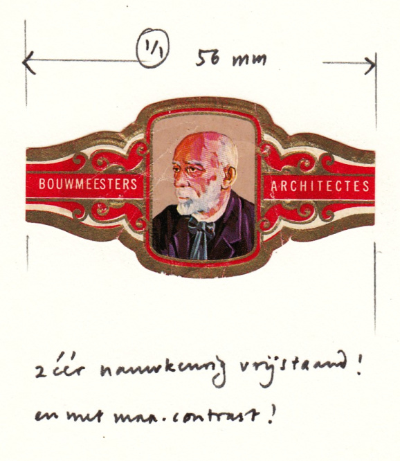 Inliggend een voor reproductie bij een Zutphense drukkerij opgeplakt sigarenbandje (!) met het portret van Berlage uit een kennelijk Belgische architectenserie.