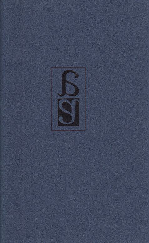 13. JANSSEN, Frans A. Buch und Schrift bei George Abrams. Meran, Offizin S, 2005. Genaaid met blauw sierkoord. 16 p. Gezet uit de Linotype Trump Mediaeval en gedrukt in 105 genummerde exemplaren door Siegfried Höllrigl. Met een proefpagina van de Augereau-antiqua. 1e druk. Heel mooi.