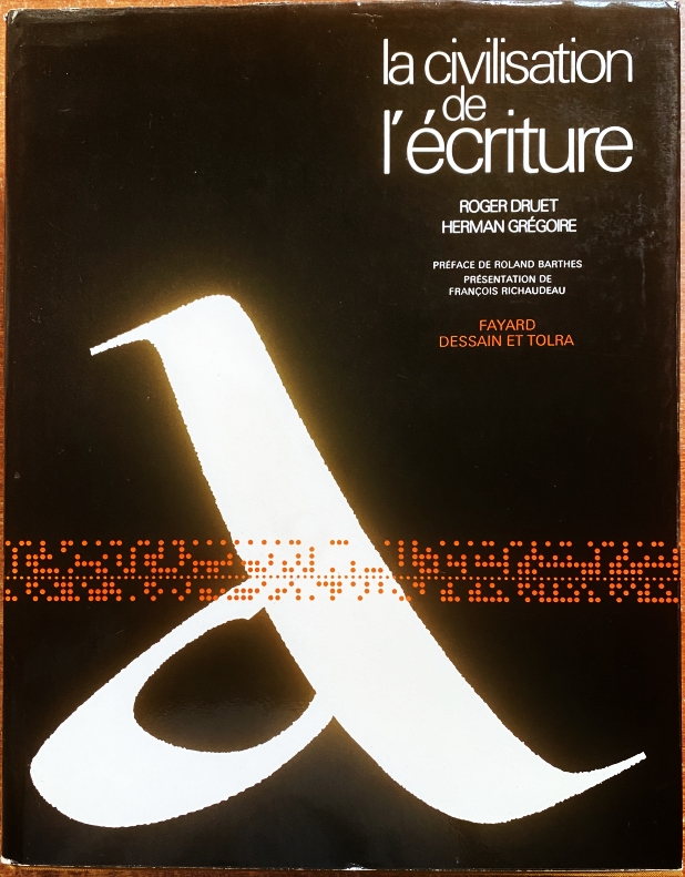 25. (NOORDZIJ, Gerrit). DRUET, Roger, & Herman GRÉGOIRE La civilisation de l’écriture. Préface de Roland Barthes. Présentation de François Richaudeau. Parijs, Fayard Dessain Tolra, 1976. 32 x 25 cm. Linnen met stofomslag. 312 p. Rijk geïllustreerd. Oranjebruine steunkleur. 1e druk. Omslag met lichte slijtsporen, verder mooi.