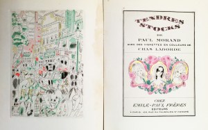 31. (PROUST, Marcel – LABORDE, Chas). MORAND, Paul Tendres Stocks. Avec une préface de Marcel Proust et des gravures de Chas Laborde. Paris, Emile-Paul Frères, 1924. 25 x 18 cm. Ingenaaid. (4), XXII, 112 p. Gedrukt op BFK-Rives-papier in 475 genummerde exemplaren. Met vier grote handgekleurde gravures, gegraveerde titelpagina en vignetten, alle vrolijk handgekleurd. Omslag heeft wat vage bruine vlekken, verder fraai en gaaf.