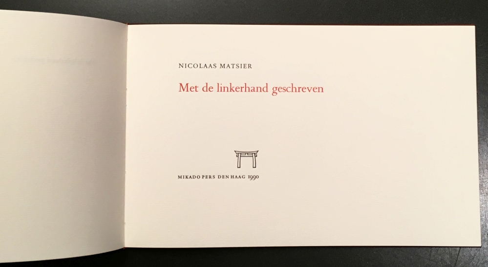 16. MATSIER, Nicolaas Met de linkerhand geschreven. (Met acht tekeningen van Willem van Malsen). Den Haag, Mikado Pers, 1990. Oblong. Linnen met motieven in blinddruk en verguld lederen titelschildje. 24 p. Met de hand gezet uit de Romulus en gedrukt in rood en zwart op Zerkall-Bütten in een oplage van 75 genummerde exemplaren. 1e druk.