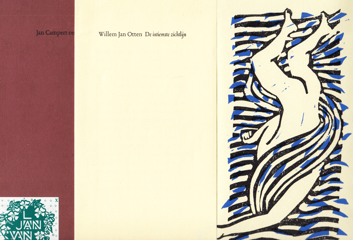 26. OTTEN, Willem Jan De intiemste zichtlijn. (Met een originele linosnede in zwart en blauw door Olivia Ettema). (Den Haag, Mikado Pers, 1995). Leporello in omslag. Met de hand gezet uit de Romanée en gedrukt in een oplage van 70 genummerde exemplaren. 1e druk. (Mooi) exlibris op binnenzijde omslag. Iets verbleekt.