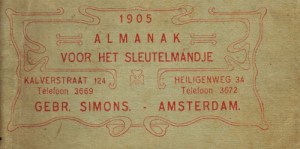 17. MINIBOEKJE Almanak voor het sleutelmandje. 1905. Alphabetische lijst van bij ons voorhanden zijnde Artikelen geschikt voor Sint Nicolaas Cadeaux. Amsterdam, Gebr. Simons, 1905. Oblong 7 x 13 cm. Geniet. (60) p. Met agenda/ verjaarskalender en advertenties. Uitvoerige lijst van Sinterklaascadeaux van deze papier- en kantoorhandel. Nietjesroest, verder zeer gaaf.