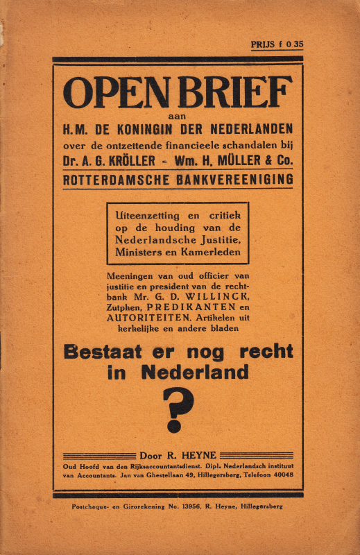 12. (KRÖLLER-MÜLLER). HEYNE, R. Bestaat er nog recht in Nederland? Open brief aan H.M. de Koningin der Nederlanden over de ontzettende financieele schandalen bij Dr. A.G. Kröller – Wm.H. Müller & Co Rotterdamsche Bankvereeniging. Hillegersberg, R. Heyne, 1933. Geniet. 40 p.